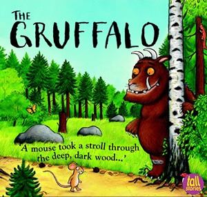 A delightful picture book with a story in rhyme, about a little mouse’s journey through a forest. The clever mouse outwits all the other creatures who want to eat him by inventing a Gruffalo….but then a Gruffalo really appears and the mouse has to scare him off, too.